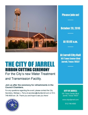 The Mayor would like to request your presence at the City of Jarrell Ribbon Cutting Ceremony on October 20, 2016 at 10:00 a.m. for the City's new Water Treatment and Transmission Facility.